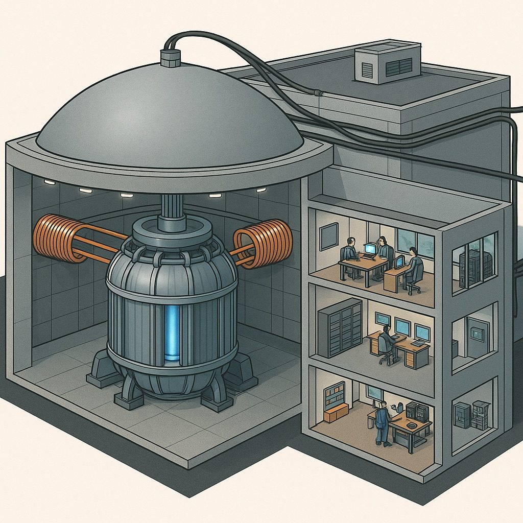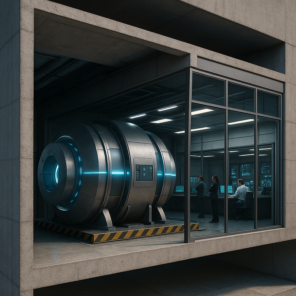 Dieses Bild zeigt unseren MEVK Titan‑X Generator in einem spezialgeschützten Gebäudekomplex. Um den Generator herum befinden sich mehrfach abgeschirmte Technikräume und ein Kontrollzentrum, das über hochsichere Datenkanäle direkt mit den anderen Modulen vernetzt ist. Jeder Raum ist durch einen eigenen Faradayschen Käfig gegen elektromagnetische Störungen und Feldausbreitung geschützt – für maximale Betriebssicherheit und Menschenschutz.